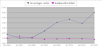 Om vi tar en titt på skuldsättningen och likviditeten så innebär det negativa resultatet att leverage-ratio har skjutit i höjden och med den den finansiella risken. Balanslikviditeten, det vill säga den kortsiktiga betalningsförmågan, ser till ytan inte överdrivet farlig ut men tittar vi närmare på det underliggande (figuren nedan) ser vi att varulagret har skjutit i höjden och där värdet har ökat med ca 50% sedan sista september 2009.